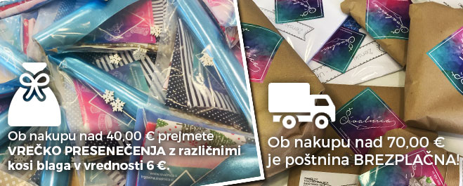 Košarica Izdelek Cena Količina Za plačilo × Kreda v svinčniku ''miška'' 10,20€ 10,20€ ZA POPOLN IZDELEK IZBERI TUDI ? Dodatki Deljiva zadrga 75cm/5mm – belo – zlata 3,20€ vključno z DDV Dodatki Deljiva zadrga 65cm/4mm – srebrna 2,60€ vključno z DDV Pripomočki Veliki sukanci 5000m 3,50€ vključno z DDV Dodatki Regulator 40 – srebrna 1,40€ vključno z DDV Dodatki Deljiva zadrga 75cm/5mm – sivo-srebrna 3,20€ vključno z DDV Dodatki Obroček – 20 – zlata 0,60€ vključno z DDV Dodatki D rinka – 20 – srebrna 0,60€ vključno z DDV Dodatki Karabin – krog – črna 1,60€ vključno z DDV Dodatki Regulator 25 – zlata 1,20€ vključno z DDV Dodatki Deljiva zadrga 70cm/5mm – zlato-črna 3,20€ vključno z DDV Dodatki Zaključek vrvice plastični 0,25€ vključno z DDV Dodatki Štoper – plastični 1 vhod – rdeča 0,70€ vključno z DDV Skupaj Skupaj 10,20€ Dostava Dostava (Pošta Slovenije): 4,50€ Za plačilo 14,70€ (vsebuje 1,84€ DDV) Nadaljuj na zaključek nakupa Kupon