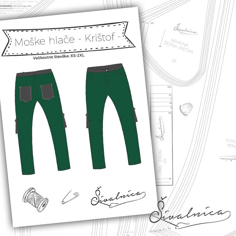 Kroj za moške hlače z žepi – Krištof – je namenjen za manj raztegljive vrste materialov, vendar pa jih vsekakor lahko izdelate tudi iz prevešanke oz. debelejšega raztegljivega materiala.