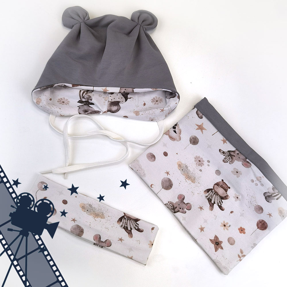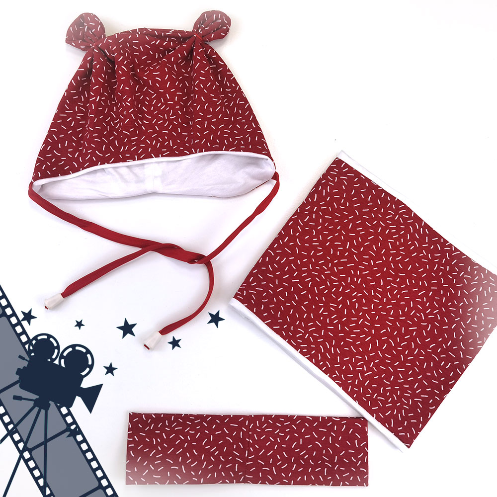 V video tečaju je prikazan postopek šivanja kape, cevastega šala in traku za ušesa.
