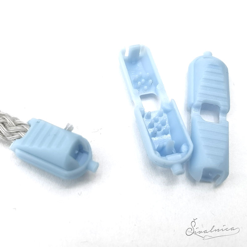 Preprost plastičen zaključek vrvice. Vrvico le vstavimo v sredino in zaključek prepognemo na polovico. Ta se zatakne skupaj in obdrži konec vrvice v notranjosti.