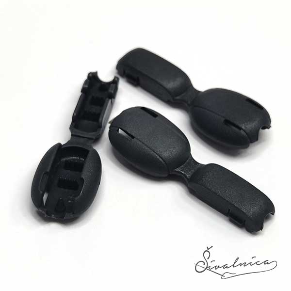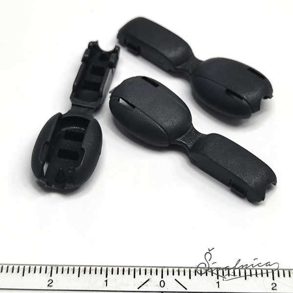 Preprost plastičen zaključek vrvice. Vrvico le vstavimo v sredino in zaključek prepognemo na polovico. Ta se zatakne skupaj in obdrži konec vrvice v notranjosti.