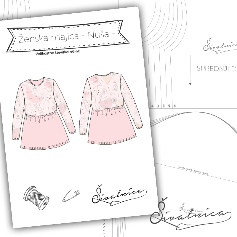 Majica ima okrogel vratni izrez izdelan na način ”lunca”, ki ga najdete tudi na blogu www.sivalnica.si. Majica ima dolge rokave, ki jih po želji lahko skrajšate in naborek v pasnem predelu.